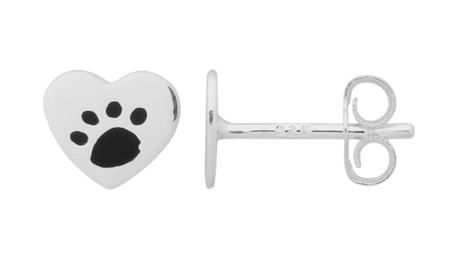 These adorably cute 925 Sterling Silver hearts have an enamelled paw print on each earstud. Each heart measures approximately 6mm, stamped 925 on the post and scrolls and supplied in pairs.