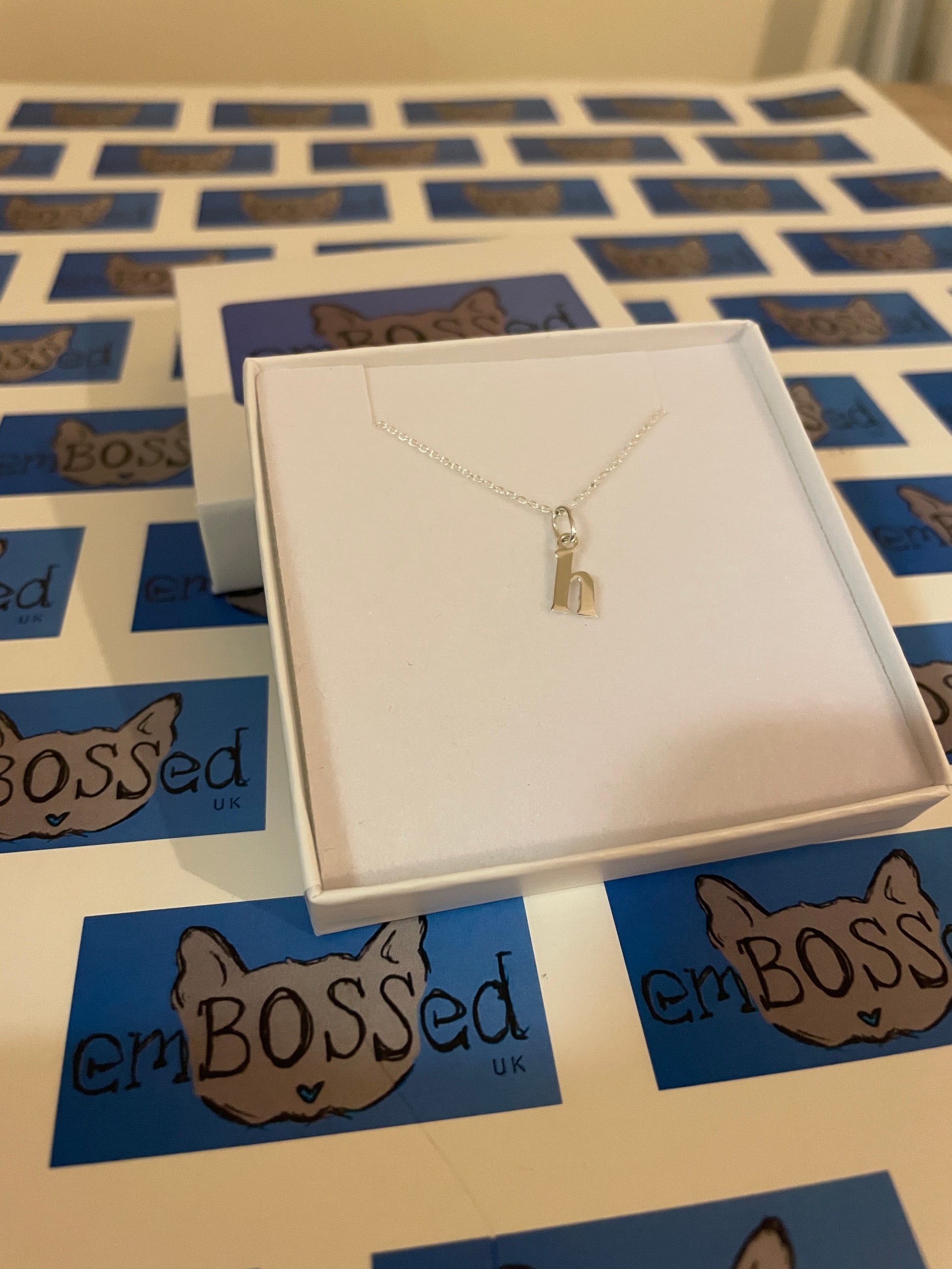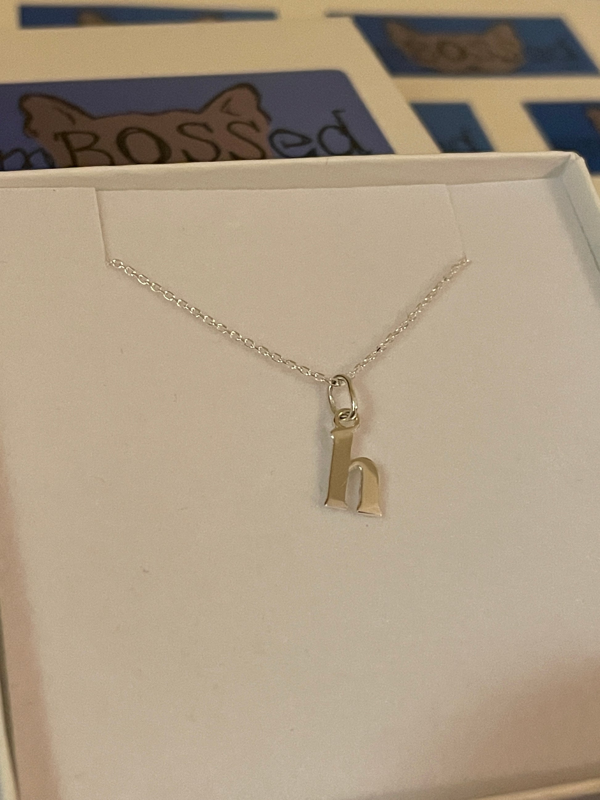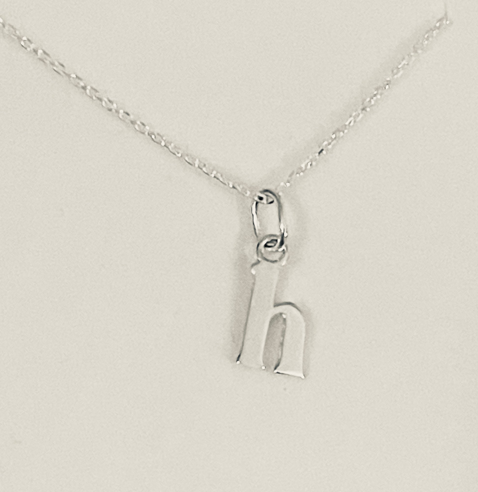 Sterling silver lowercase initial h measuring 9mm by 4mm, on a 20" Sterling Silver superior elongated diamond cut trace chain.